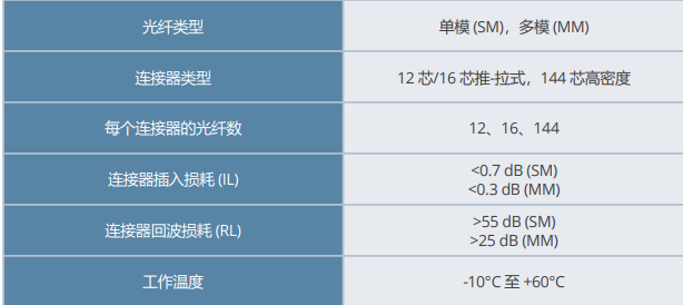 规格参考信息 包装:单独装袋设计单位:毫米标准:GR-1435 连接器类型:12 芯/16 芯推-拉式,144 芯高密度 光纤类型: SM:OS1、OS2MM:OM3、OM4、OM5RoHS:是不含卤素:是